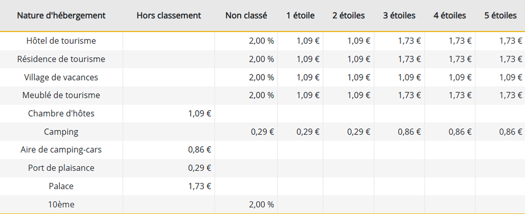 Les tarifs 2026 de la taxe de séjour indiqués ci-dessous intègrent les taxes additionnelles.